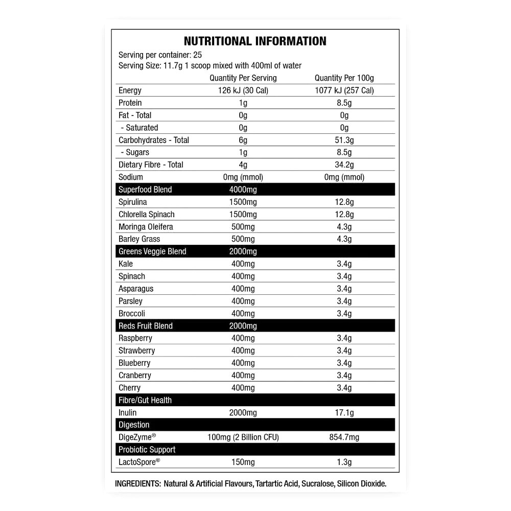 Serious Greens is a unique formulation that combines the goodness of green and red superfoods. Packed with nutrient-rich ingredients like Spirulina, Chlorella, Spinach, Kale, and a blend of red fruits including Raspberry, Strawberry, Blueberry, and more, Serious Greens delivers a potent dose of vitamins, minerals, antioxidants, and phytonutrients.